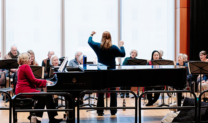 Connecting Voices offers a unique and joy-filled choral experience for people living with dementia and their caregivers. The chorus meets weekly in Antonello Hall at MacPhail’s Minneapolis location. Together, we sing old and new songs, learn vocal technique and ensemble skills, share musical memories and build a community to support each other in life’s journey. Our culminating concert allows us to display our musical accomplishments and demonstrate how we defy dementia together through music. No vocal experience is required, just a love of singing!